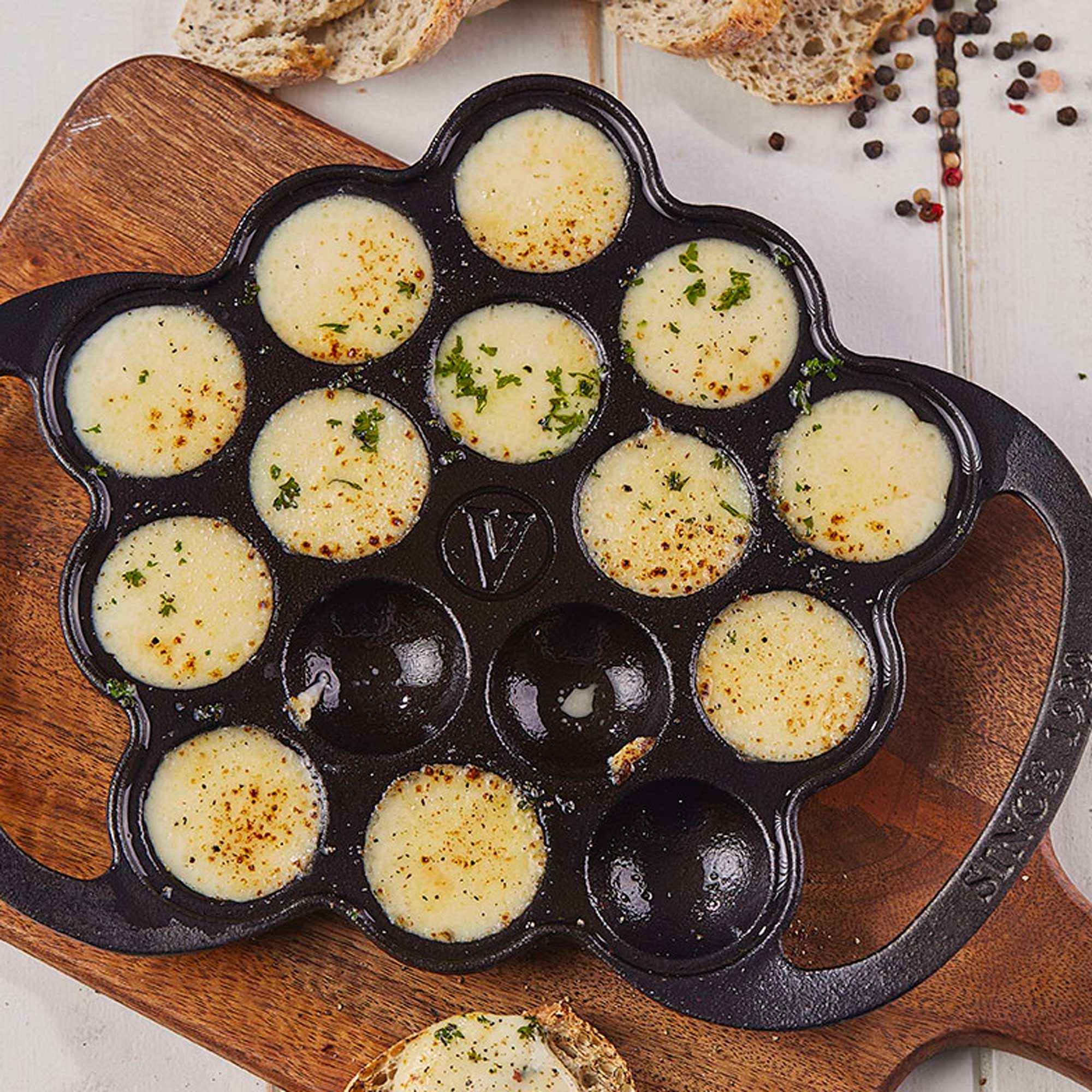 The Victoria Cast Iron Dutch Pancake Pan is made for creating perfectly round poffertjes, aebleskiver, kanom krok, mini muffins, and more. Whether you're exploring traditional recipes or modern takes on bite-sized treats, this pan offers superior heat distribution, rugged durability, and that signature cast iron sear.