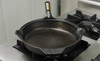 Use coarse salt, a plastic spatula, or chainmail scrubber for stuck-on food. Avoid abrasive sponges unless removing seasoning.