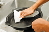 Hand wash with hot water and mild soap while the pan is still warm.